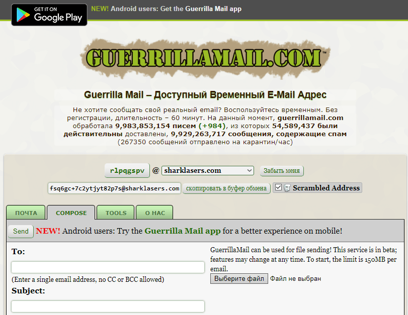 Существует в веб-версии и в форме мобильного приложения для Android. Он предназначен как для получения, так и для отправки писем с временного адреса. Причем с вложенными файлами. Максимальный вес вложения составляет 150 Mb, а время хранения на сервере — 24 часа.