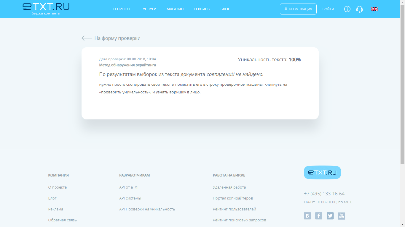 Эти сервисы предоставляют URL сайта и процент совпадений по тексту. Для этого нужно просто скопировать свой текст и поместить его в строку проверочной программы, кликнуть на «проверить уникальность».
