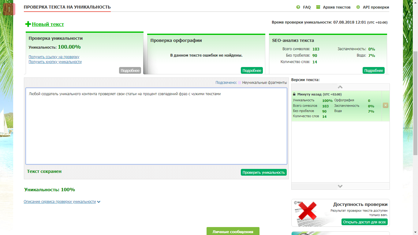 Проверку я обычно провожу сразу после написания статьи, до ее публикации. Во-первых, убеждаюсь в уникальности своего текста. Обычно она 96 — 100%. Рекомендую оставлять скриншоты этих проверок. Они являются документальными свидетельствами того, что это тексты мои и они уникальны. Это одно из реальных подтверждений авторства в борьбе с воровством.