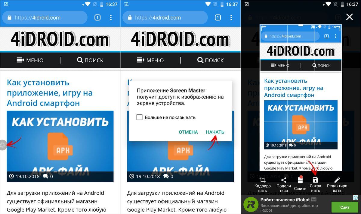Если на смартфоне не работают аппаратные кнопки громкости или клавиша блокировки, пригодятся программы, которые «умеют» захватывать скриншоты. К примеру, приложения и Mobizen , предназначенные для , поддерживают такую функцию. Скачайте любое из них, запустите и предоставьте необходимые разрешения, после чего сбоку появится «плавающая» кнопка. Щелкните на нее и откроется список доступных действий. Выберите иконку с камерой и нажмите «Начать» во всплывающем окне. В тот же момент создастся скриншот.