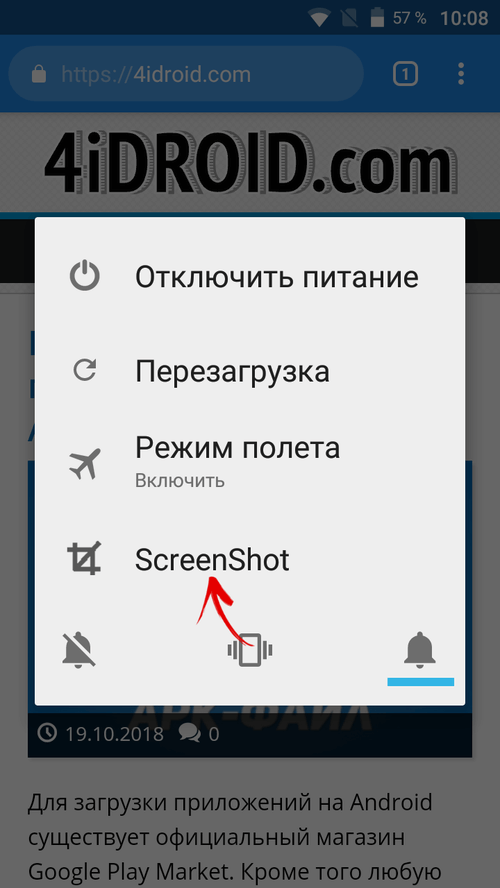 Другой стандартный способ запечатлеть, что отображается на дисплее – долгим нажатием по кнопке питания вызвать меню с доступными действиями и выбрать нужную опцию. Обычно список состоит из пунктов: «Выключение», «Перезагрузка», «Режим полета», а в некоторых прошивках (чаще в кастомных) присутствует и «Скриншот». Нас интересует последний.