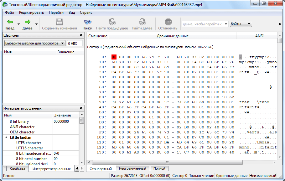 О том, что программа R-Studio не просто приложение для восстановления данных, а многофункциональный комбайн для работы с дисками, свидетельствует то, что у него имеется инструмент для редактирования дисковой информации, которым является шестнадцатеричный редактор. С его помощью можно редактировать свойства NTFS файлов.