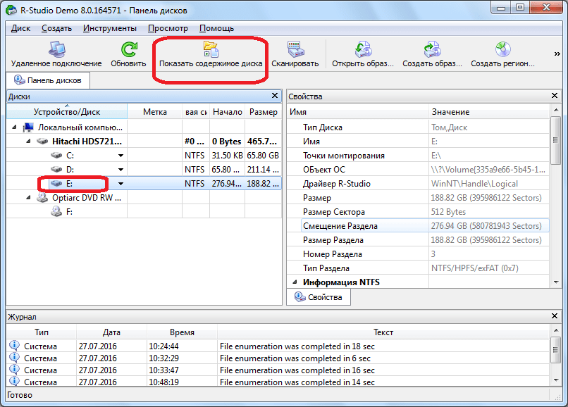 После завершения сканирования вы увидите все доступные файловые системы. Выберите одну из них и нажмите "Показать содержимое диска" . Кстати, та же опция доступна из контекстного меню: