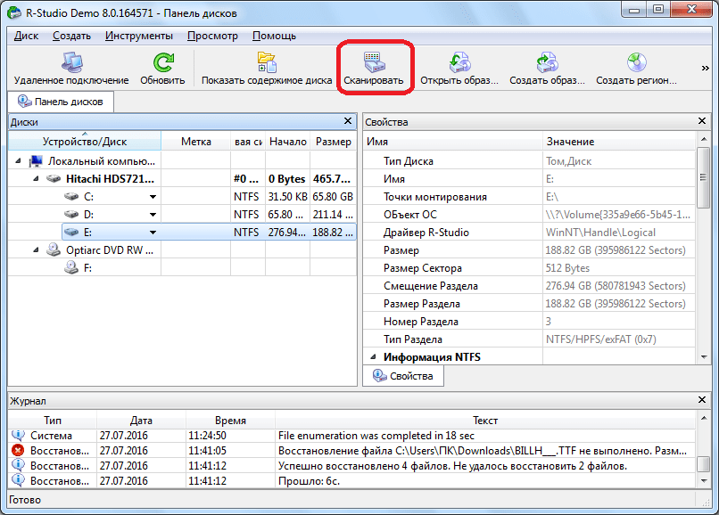 Чтобы восстановить один из удалённых разделов с помощью R-Studio, запускаем программу и выделяем жесткий диск, из которого необходимо восстановить раздел, нажимаем кнопку «Сканировать» .