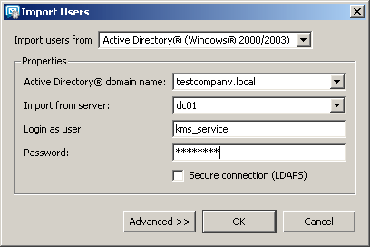 При третьем способе, происходит импорт учетных записей из домена Active Directory и создание на их основе пользователей в локальной базе KMS (как в первом варианте).