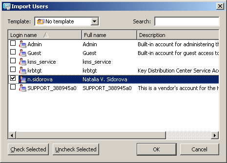 Имя домена, контроллера, пользователя для подключения к AD указываем такие же, как в предыдушем пункте при маппинге пользователей из Active Directory. В результате KMS нам предлагает выбрать пользователей для импорта, выбираем нужных и нажимаем кнопку ОК: