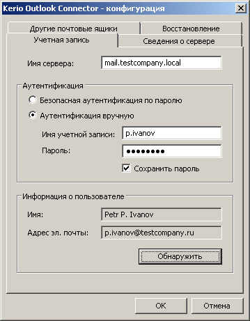 Нажимаем кнопку Обнаружить, должна отобразиться корректная информация о пользователе. Далее ОК, ОК, Готово и заходим в Outlook. На этом первоначальная настройка Outlook закончена, пользователь может отправлять и принимать почту.