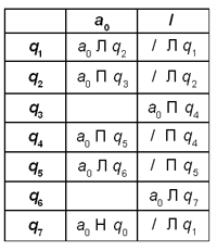 Строки в таблице соответствуют символам выбранного алфавита A, а столбцы — состояниям автомата Q = {q0,q1,…,qm}. В начале работы машина Тьюринга находится в состоянии q1. Состояние q0 — это конечное состояние, попав в него, автомат заканчивает работу.