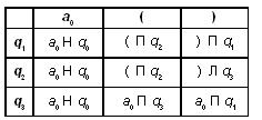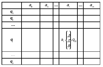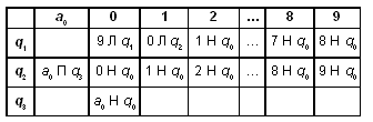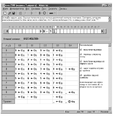 Теперь можно приступить непосредственно к записи алгоритма решения задачи. Он задается в виде таблицы: в каждый столбец верхней строчки заносятся символы внутреннего алфавита, в каждую строчку первого столбца - символы внешнего алфавита. В ячейках на пересечении других столбцов и строчек помещаются команды. Если на пересечении какой-либо строки и какого-либо столбца мы получим пустую клетку, то это означает, что в данном внутреннем состоянии данный символ встретиться не может.