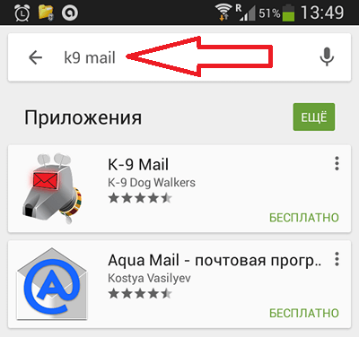 Для начала открываем Play Market и вводим фразу «K9 Mail» в поисковую строку. После чего открываем страницу данного приложения.
