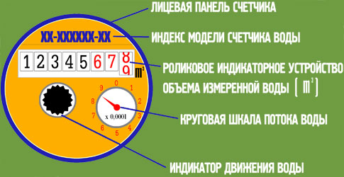 На панели водосчетчика в окошечке отображаются восемь цифровых значений. Пять из них – черного цвета, оставшиеся три – красного. Первые пять цифр черного цвета показывают количество потребленных кубических метров жидкости, а три цифры красного цвета – количество литров воды, использованной вами.