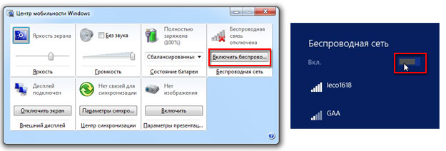 В Windows 7 это можно сделать выбрав “Центр мобильности” в “Панели управления” нажав клавиши Windows+X, а в Windows 8.1 нажав на значке Сеть справа в панели задач и выбрав ВКЛ. Пропустите этот пункт, если беспроводная связь у Вас уже включена!