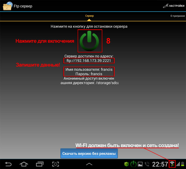 6. В программе “Ftp сервер”, нажмите на кнопке включения, а затем запишите или запомните данные: адрес сервера (ftp://192.168.173.39:2221 ) и имя (francis ) и пароль (francis ).