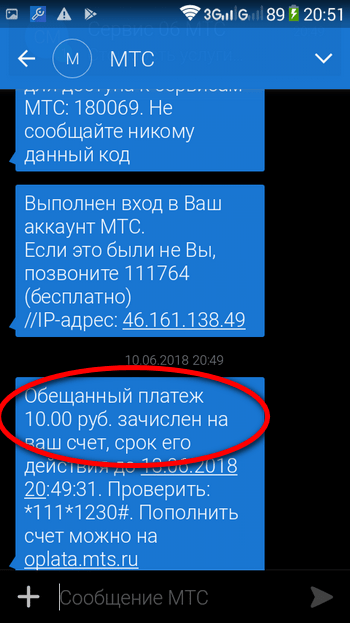 Важно: есть ещё метод, позволяющий брать у МТС в долг в рамках «Обещанного платежа», - звонок по номеру 1113 . Автоматический голосовой помощник предложит звонящему ввести сумму пополнения баланса и подтвердить своё решение. Средства будут зачислены на счёт, о чём система и уведомит клиента в очередном коротком текстовом сообщении.