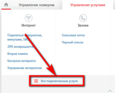 - В открывшемся окне кликнуть левой клавишей мыши по кнопке «Все подключённые услуги».