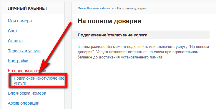 - В личном кабинете МТС, перейдя в раздел «Все подключённые услуги», выбрать в левом боковом меню пункт «На полном доверии». Используя размещённую там ссылку, можно подключать и отключать опцию, не уходя с сайта.