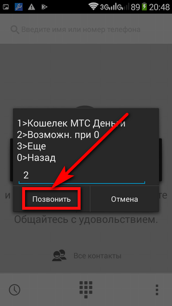 - В следующем окне ввести цифру 2 («Возможности при нуле»), после чего вновь, ориентируясь на текущую ситуацию, воспользоваться кнопками «Позвонить» или «Отмена».