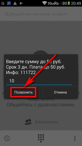 - В открывшемся системном окне потребуется сразу обозначить сумму, которую пользователь хотел бы взять у оператора в долг, после чего воспользоваться уже знакомыми кнопками «Позвонить» или «Отмена».