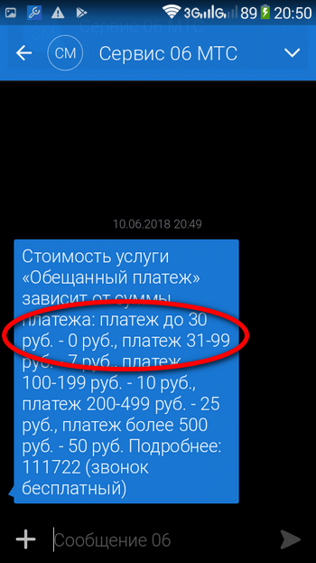 - В первом сервисном сообщении пользователю будут предоставлены сведения о стоимости предоставления услуги «Обещанный платёж» в зависимости от суммы, которую он намеревается взять в долг.