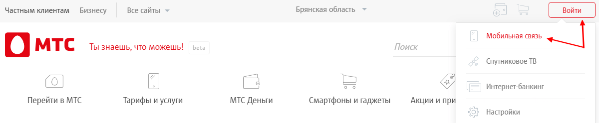 - Начать авторизацию в личном кабинете, наведя указатель мыши на расположенную справа вверху кнопку «Войти» и выбрав в выпадающем списке самую верхнюю строчку «Мобильная связь».