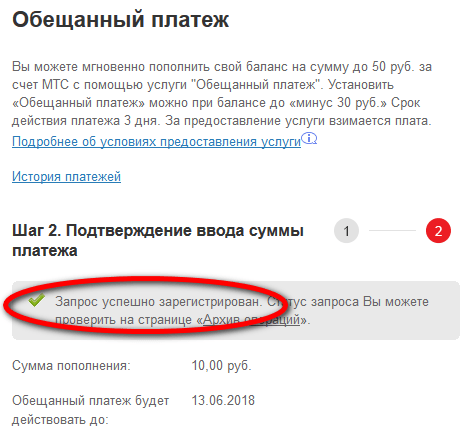 - Никаких лишних действий в этом случае делать не придётся: после того как будет указана необходимая сумма долга, абонент получит извещение системы об регистрации запроса, а чуть позже - SMS-уведомление о зачислении средств на баланс.