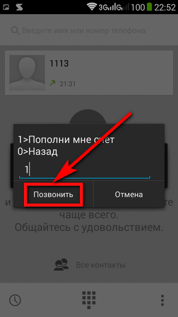 - Чтобы перейти к услуге «Пополни мне счёт», следует далее использовать цифру 1 (и снова «Позвонить»).
