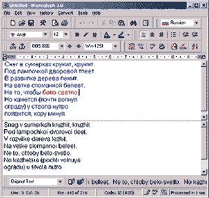 Перекодировка текста или выделенного фрагмента из кодировок DOS-866, KOI8-R, MAC и ISO в кодировку MS Windows (ANSI/Win-1251) и обратно, а также конвертирование текста в транслит и из него по двум настраиваемым таблицам при перекодировании происходит физическая замена кодов символов;