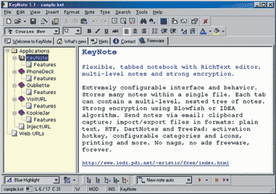 При желании к KeyNote можно подключить модуль WorldWeb, содержащий английские словарь и тезаурус, а также расширить программу за счет плагинов. KeyNote поддерживает многопользовательский режим с возможностью настройки для каждого пользователя.