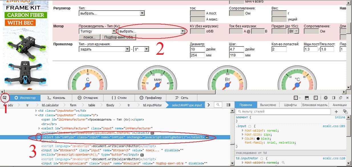 Нажимаем в браузере F12 (например в хроме или firefox) попадаем в "инспектора". Нажимаем на стрелку (на скрине отмечена цифрой 1), затем нажимаем на окно выбора (чего либо, пример с двигателем) по номером два на скрине и видим, что выделилась строка (под цифрой 3).