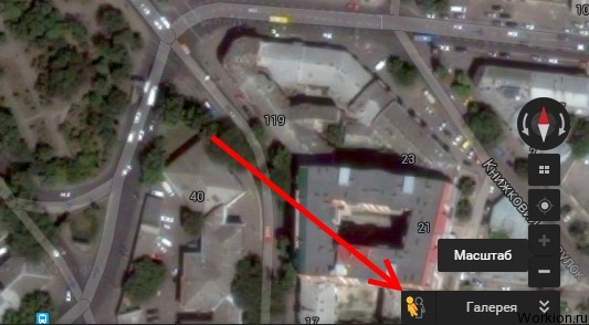 Это активирует режим просмотра улиц. Периодически по городам и поселкам ездит машина Гугла, которая фиксирует окружающие объекты. При просмотре улиц в этом режиме, можно даже разглядеть вывески: