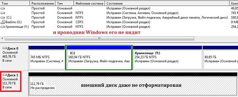 В этом абзаце я повторю процедуру, но на этот раз используем жёсткий диск в боксе. Подключаем через USB порт (здесь скорости не такие, как напрямую через SATA интерфейс, зато ситуация самая жизненная). К слову сказать, большинство операций здесь доступно и с помощью программ сторонних разработчиков, например AOMEY Partition Assistant, которая уже может быть установлена. Но почти всё умеет и сама Windows.