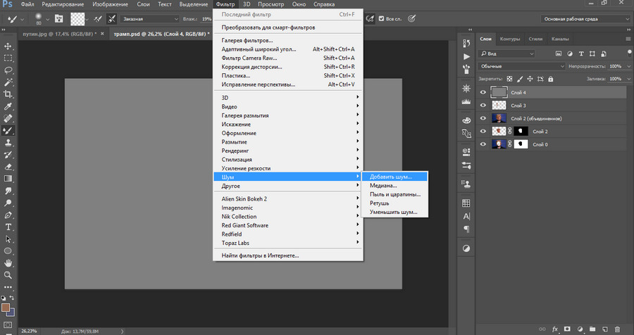 Переходим в меню Фильтр-Шум-Добавить шум (Filter-Noise-Add Noise):