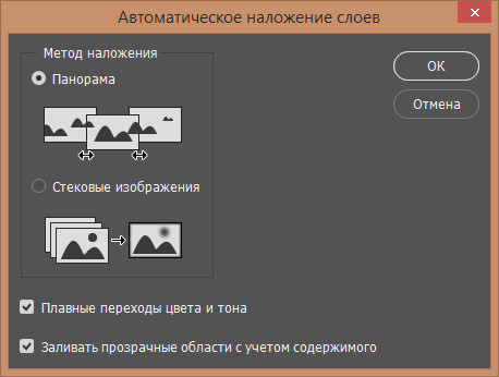 Переходим в Редактирование — Автоналожение слоев (Edit — Auto — Blend Layers):
