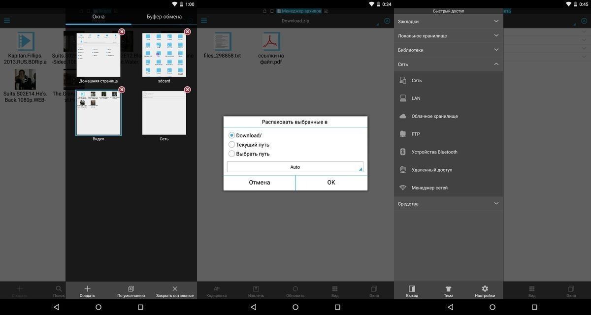 Он включает в себя дизайн в Материальном стиле, поддержку облачных хранилищ, root-доступ, поддержку FTP, SFTP, WebDav, SMB и CIFS, работу с архивами, поддержку ChromeCast, и даже имеется поддержка тем.
