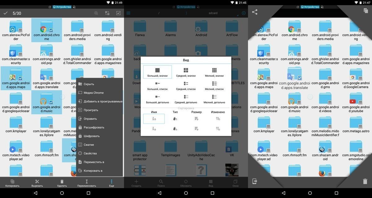В отличии от некоторых проводников ES File Explorer выглядит весьма стильно. По умолчанию папки и файлы расположены в виде сетки с большими значками. Нажав на нижней панели пункт «Вид» вы можете изменить отображение, выбрав средние или мелкие значки, либо же вовсе включить режим списка с различной степенью подробности.